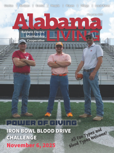 Alabama Living magazine is published each month by the Alabama Rural Electric Association, our statewide organization, and mailed to Baldwin EMC members. Our local editors contribute seven pages of local cooperative news, information and feature articles to each issue. Alabama Living is an excellent source of state and national news of legislation and trends affecting your electric cooperative, informational and educational articles about wise uses of energy, practical home and garden tips, recipes, and feature stories about interesting people and places around the state.